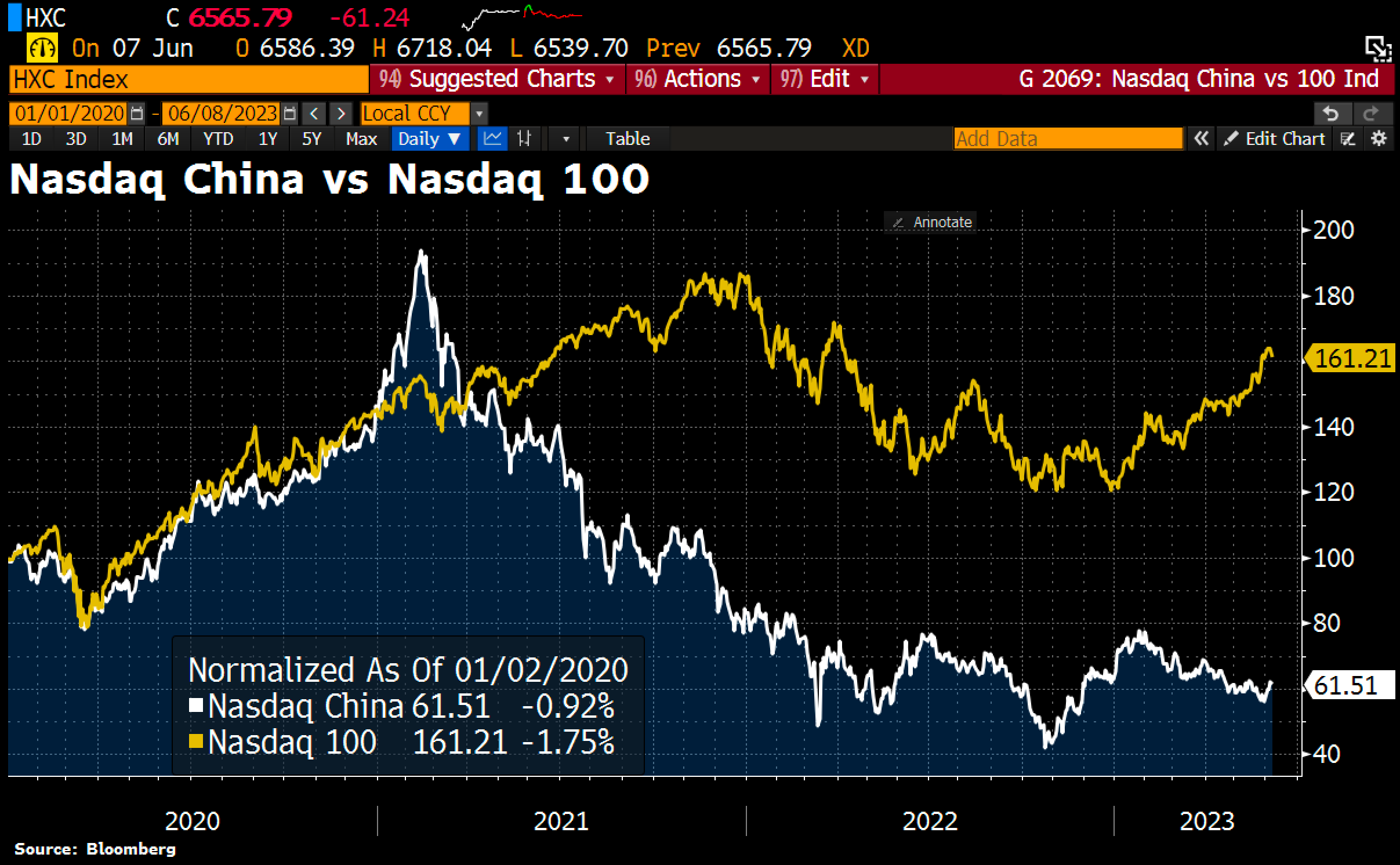 В то время как Big Tech в США восстановил капитализацию в этом году, Big Tech в Китае все больше и больше становится Small Tech. Индекс Nasdaq Dragon с китайскими акциями по-прежнему на 68% ниже своего исторического максимума, а Nasdaq 100 всего на 14%.