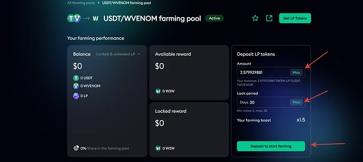 Выбираем пул ликвидности с нашими токенами WVENOM\USDT. Выбиваем колл-во и ставим на фарминг.
