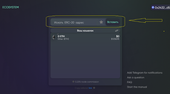 3. У центрі вставляємо адресу криптовалютного гаманця Ефіріум, який вибрали, для копіювання.