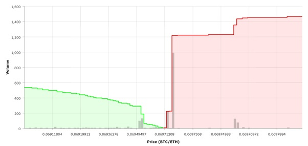 Ось тут і з’являється книга замовлень. У книзі замовлень ви можете побачити обсяг замовлень у кожній ціновій точці як для продавців, так і для покупців. Досвідчені трейдери можуть зробити висновок про можливі зміни ціни з форми книги ордерів. Це тема для цілої іншої статті (або книги), але ось базовий приклад: якщо я бачу, що 1 BTC продається за 20 ETH, і є невелика кількість продавців, які бажають продати 1 BTC за 20,1, 20,2, 20,3, і 20,4 ETH, але великий обсяг при 20,5 ETH, трейдер може зробити висновок, що за достатнього тиску покупців покупці швидко піднімуть цей невеликий обсяг до 20,5 ETH, де обсяг настільки великий, що створює більше пропозиції, ніж попиту — ака, стіна. Таким чином, трейдер може розмістити замовлення просто під цією стіною, наприклад, за 20,47 ETH, і все ще мати розумне очікування, що його буде виконано. Без книги замовлень,