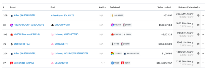 Збір цих зборів — це те, що зазвичай називають фермерством. Ліквідність настільки важлива, що проекти готові платити дуже високі доходи за пули, де ліквідність низька або існує висока ймовірність того, що половина пари впаде в ціні. Ось чому для деяких пар ви можете знайти показники прибутковості вище 1000%. Звучить божевільно, звичайно. Це працює як азартна гра, що LP отримає достатню віддачу від початкових інвестицій достатньо швидко до того, як ціна одного з токенів у парі впаде. Подивіться на цей список ферм на Coingecko (переконайтесь, що сортуєте за найвищою прибутковістю). На момент написання цього у верхній частині ми маємо наступне: