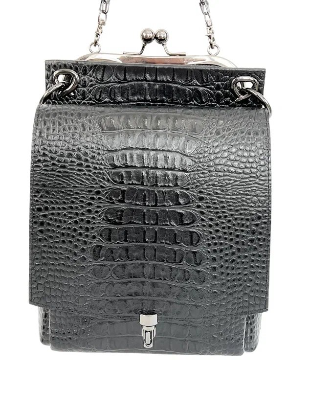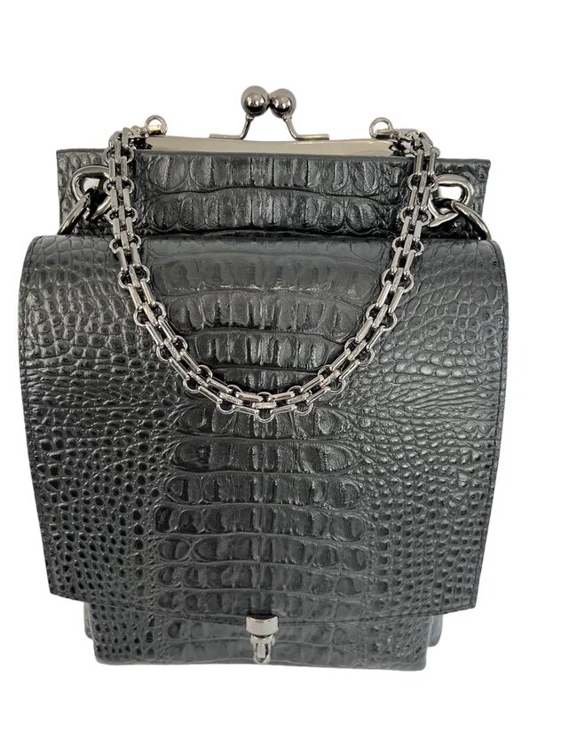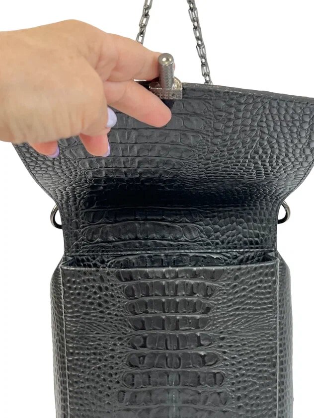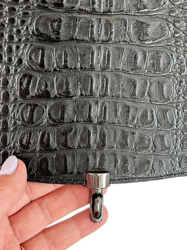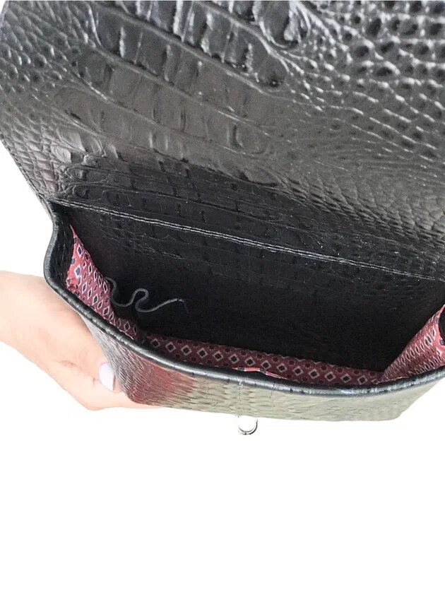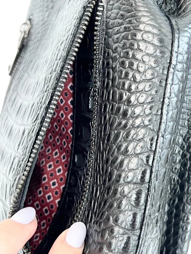 Эта сумка сшита из плотной, прочной и красивой кожи черного цвета с тиснением "под крокодила". Она выработана из шкур крупного рогатого скота.