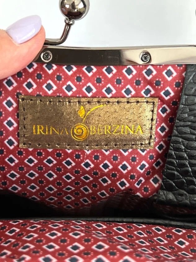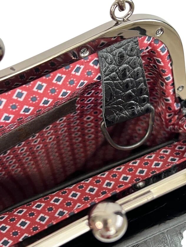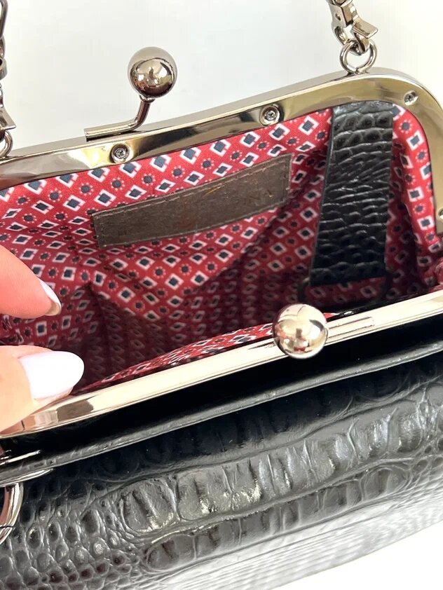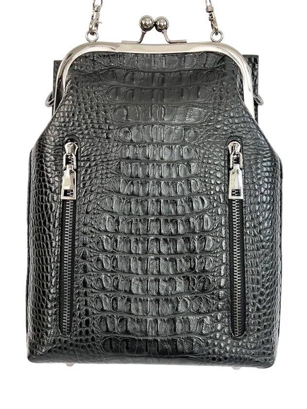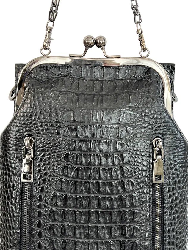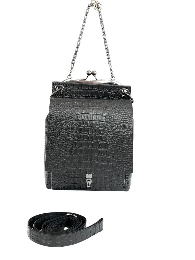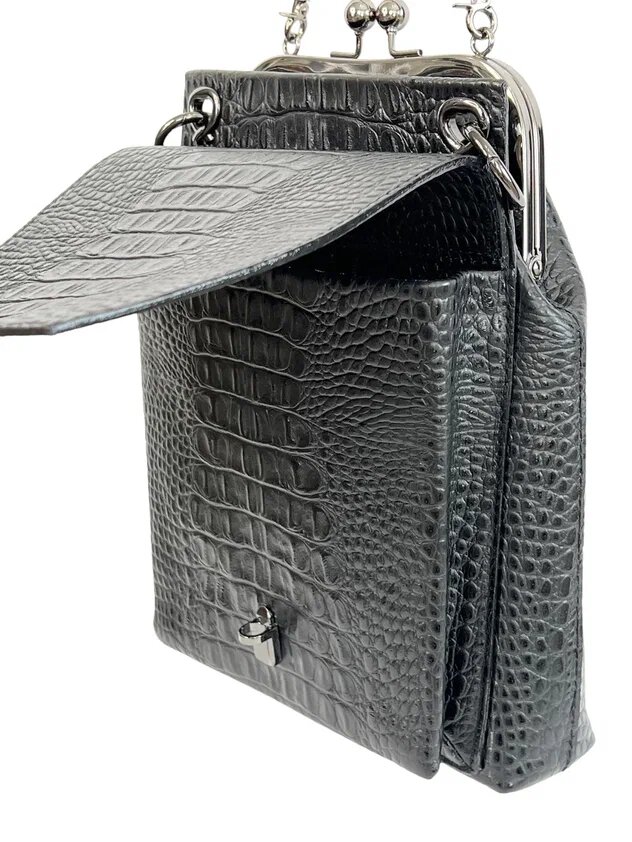 Эта сумка сшита из плотной, прочной и красивой кожи черного цвета с тиснением "под крокодила". Она выработана из шкур крупного рогатого скота.