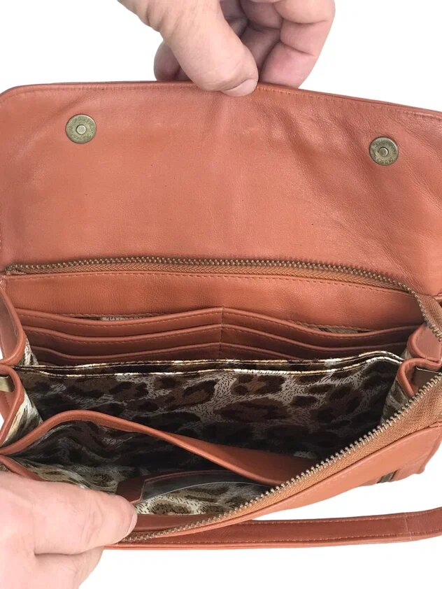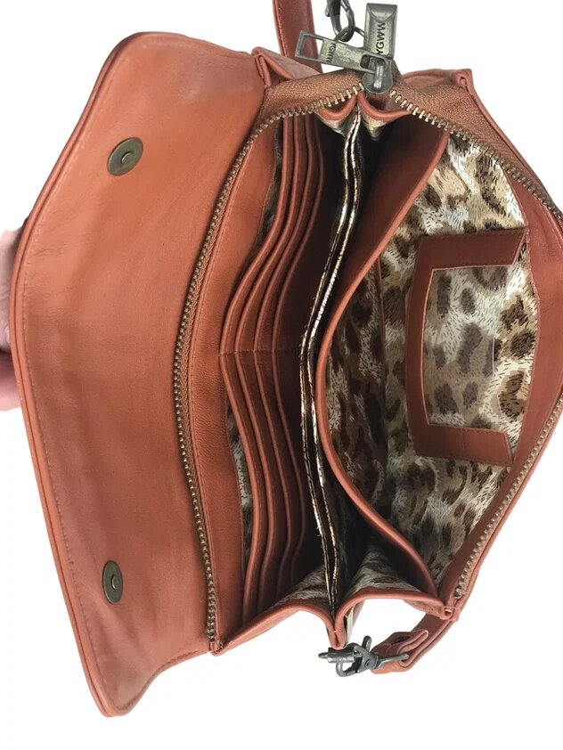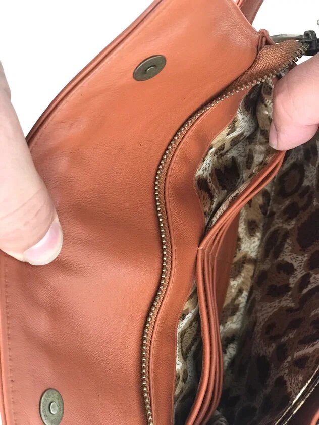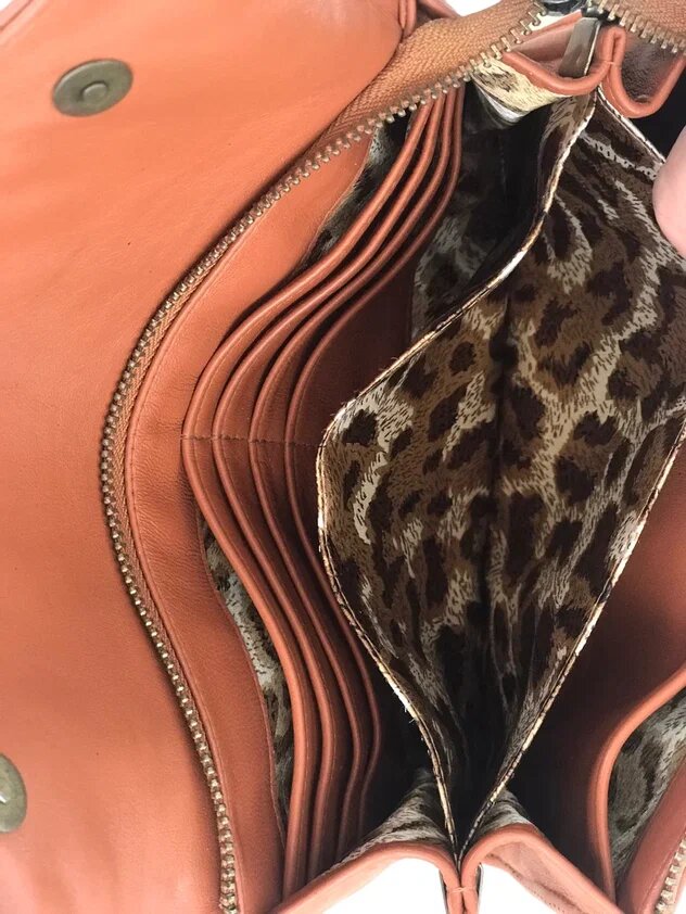 В качестве подкладки для внутреннего пространства клатча использована прочная синтетическая ткань атласного переплетения с набивным рисунком "под леопарда".