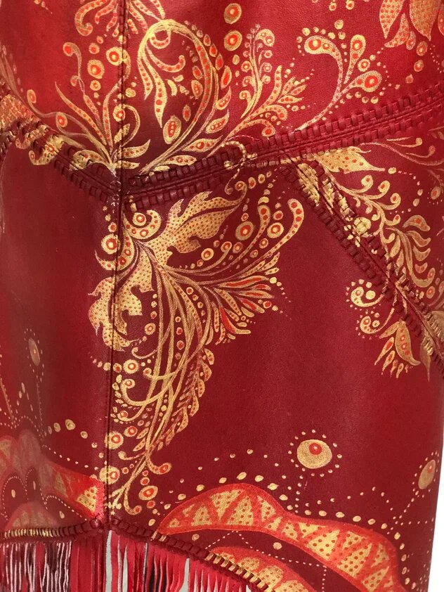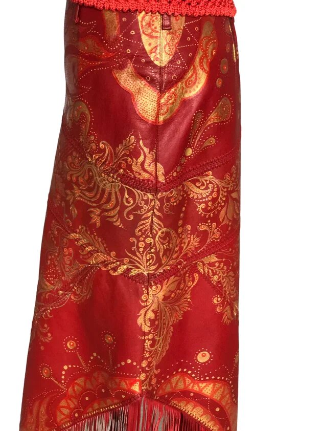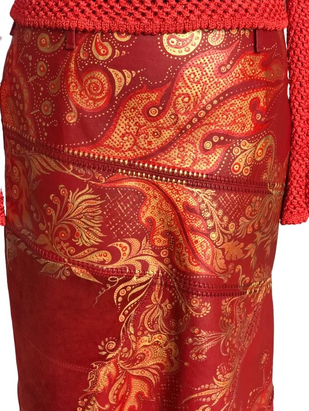 Боковые швы соединяют переднюю и заднюю части юбки, при этом все ее кожаные детали расположены симметрично, а рисунок делает эти швы малозаметными.