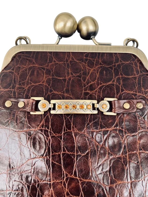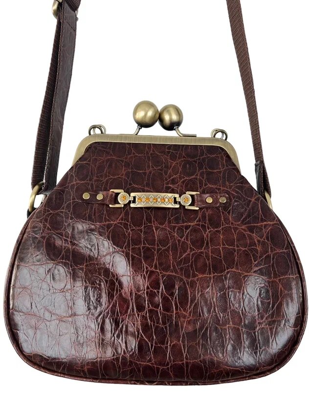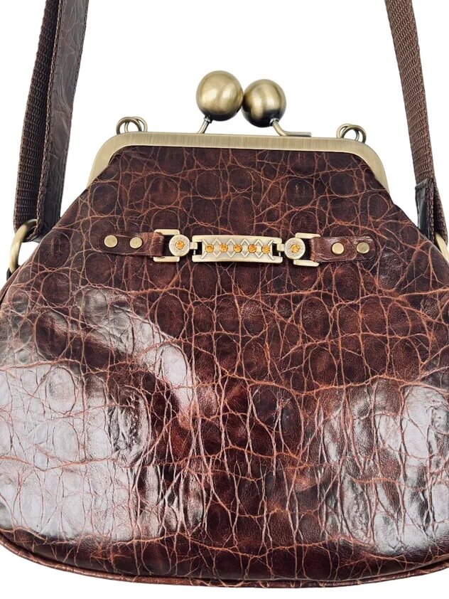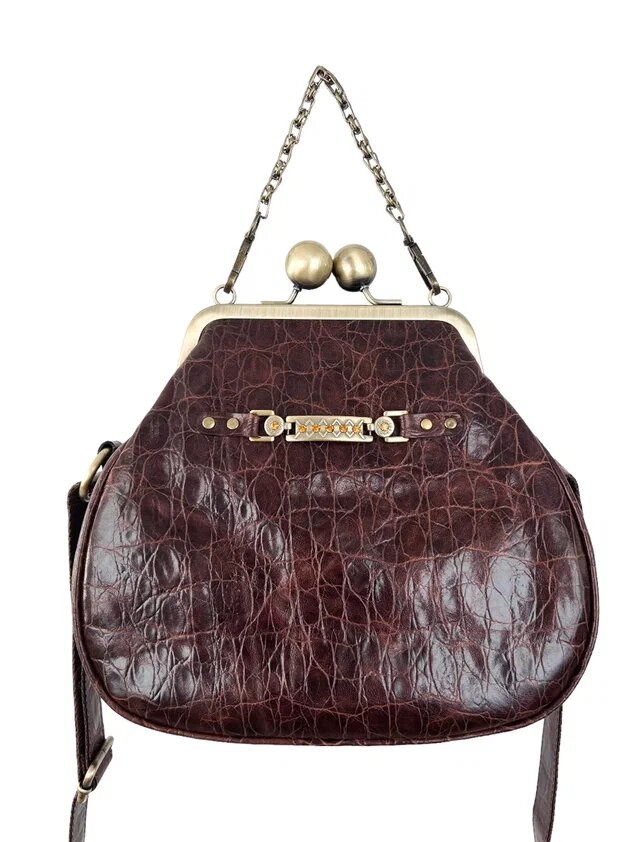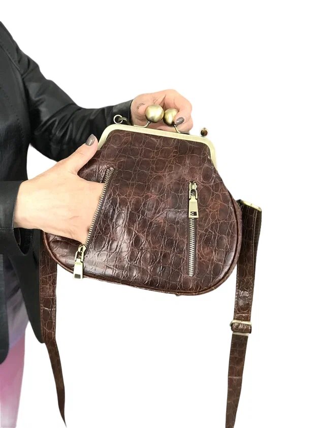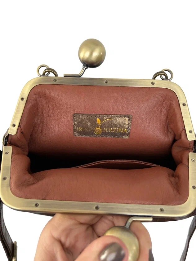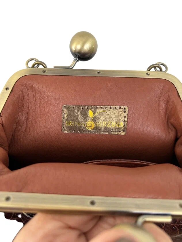 Рамочный замок-фермуар и вся остальная фурнитура подобраны цвета "антик". Ширина фермуара составляет 18 сантиметров, а поскольку крой любой сумки с фермуаром зависит от его ширины, то модель "Рета-11" можно отнести к сумкам среднего размера.