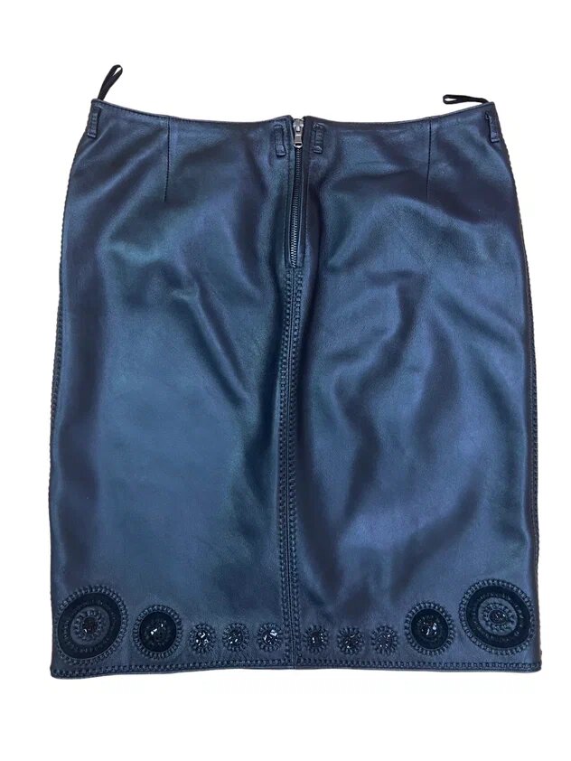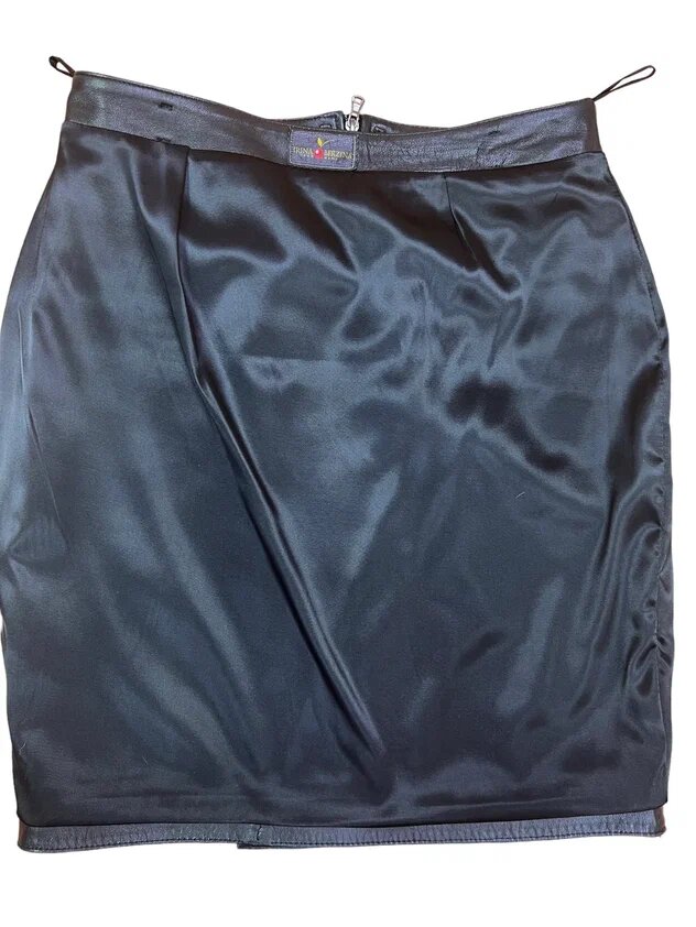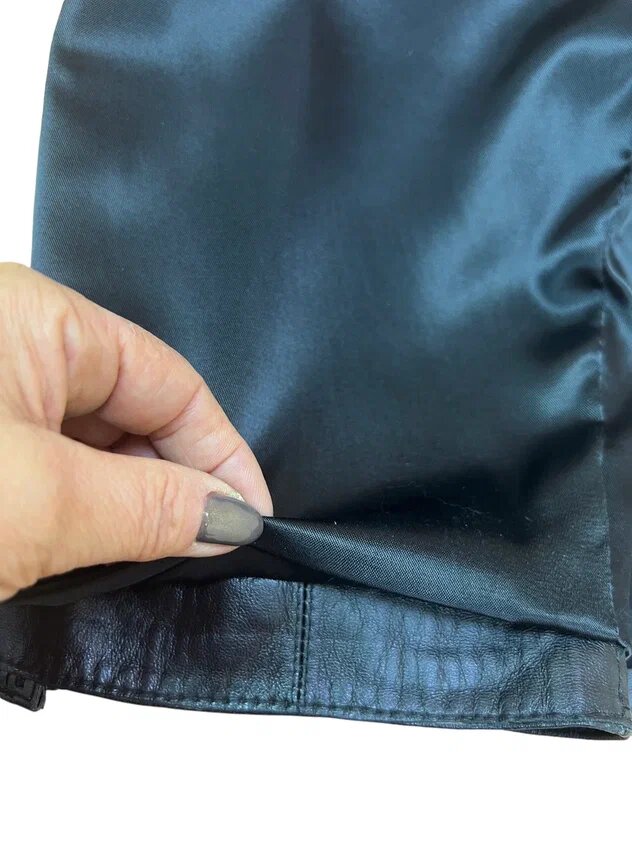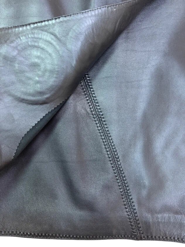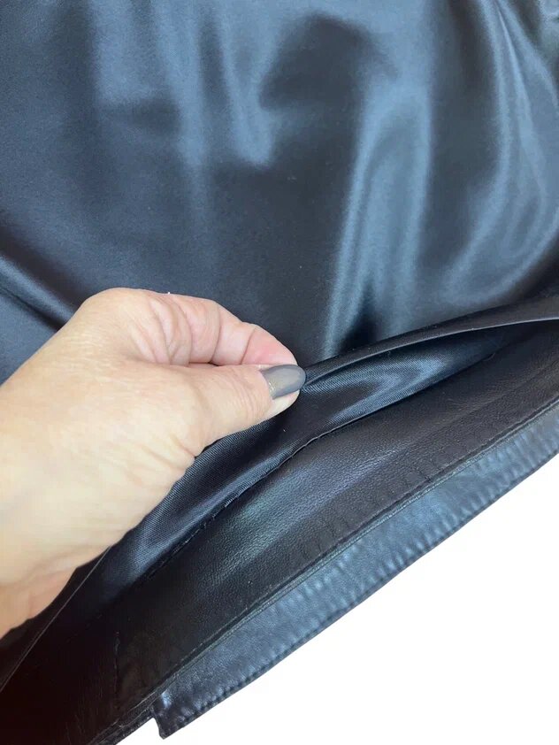 Юбка сшита из одежной кожи шеврет черного цвета. Эта кожа вырабатывается хромовым дублением из шкур овец и баранов и обладает мягкостью, достаточной плотностью. Можно сказать, что это самая распространенная кожа для пошива одежды.