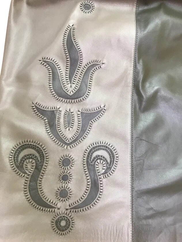 На левой стороне переда мы сделали аппликацию с использованием более темной кожи, из которой сшита задняя часть юбки.