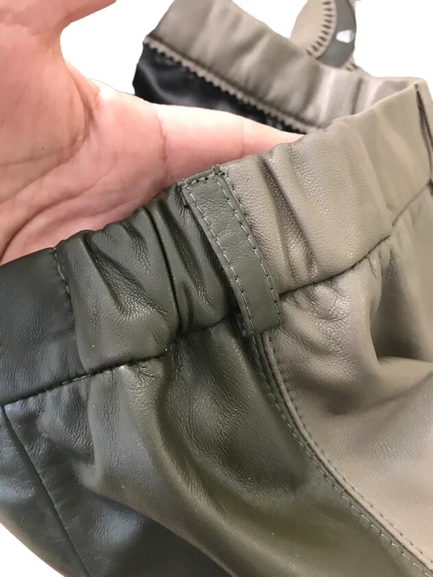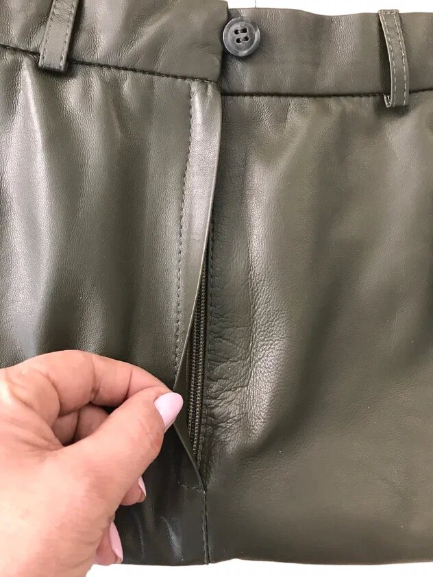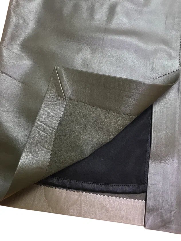 Все кожаные юбки мы всегда шьем с подкладкой. Здесь в качестве подкладочной ткани используется стрейч-атлас - ткань атласного переплетения, способная растягиваться благодаря наличию в ее составе полиуретановых спандекс-волокон.