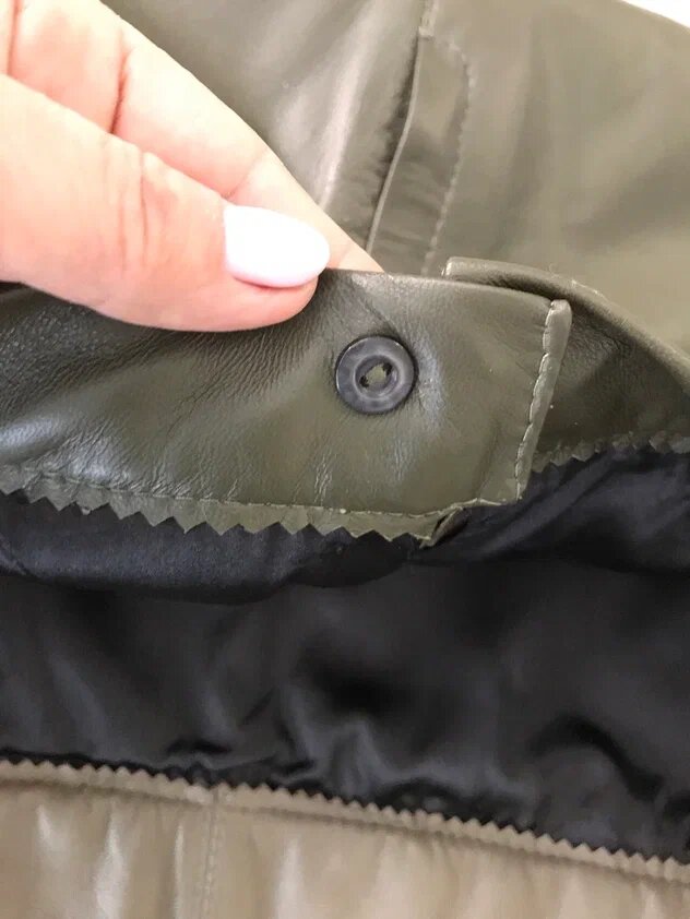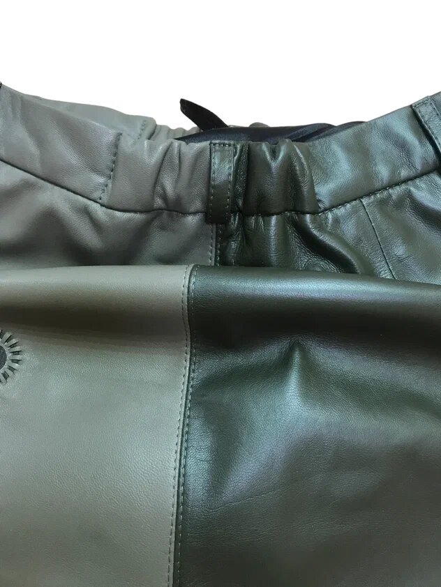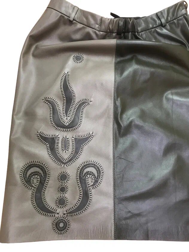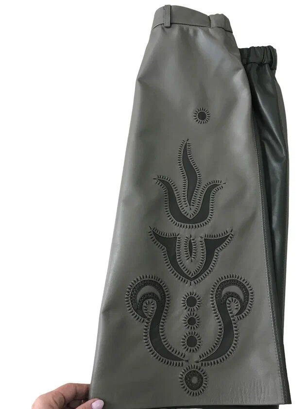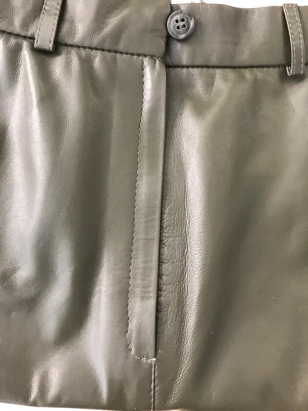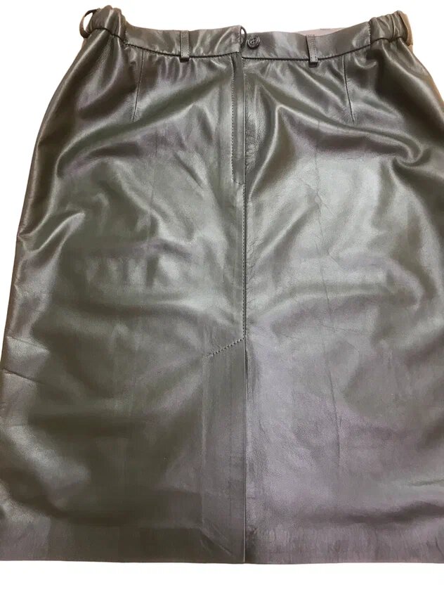 Передние детали юбки сшиты из кожи оливкового цвета более светлого тона, чем задние детали.