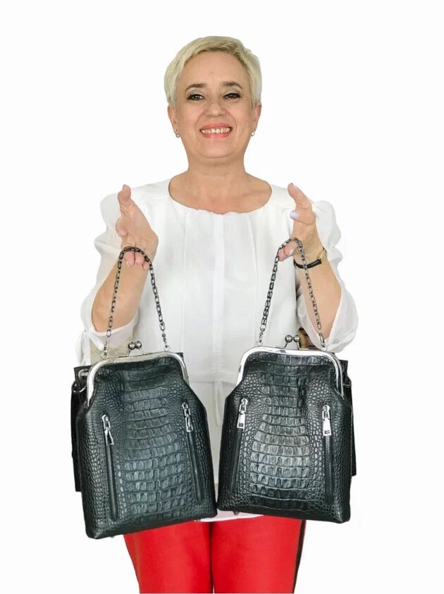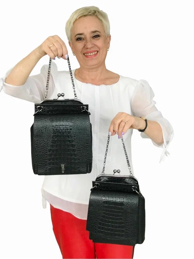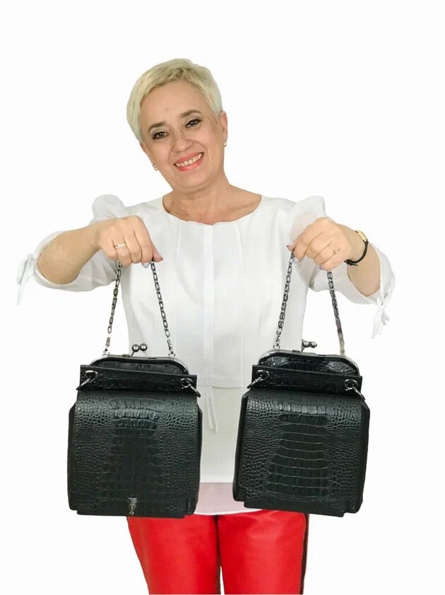 Обе сумки сшиты из плотной галантерейной кожи черного цвета с тиснением "под крокодила".