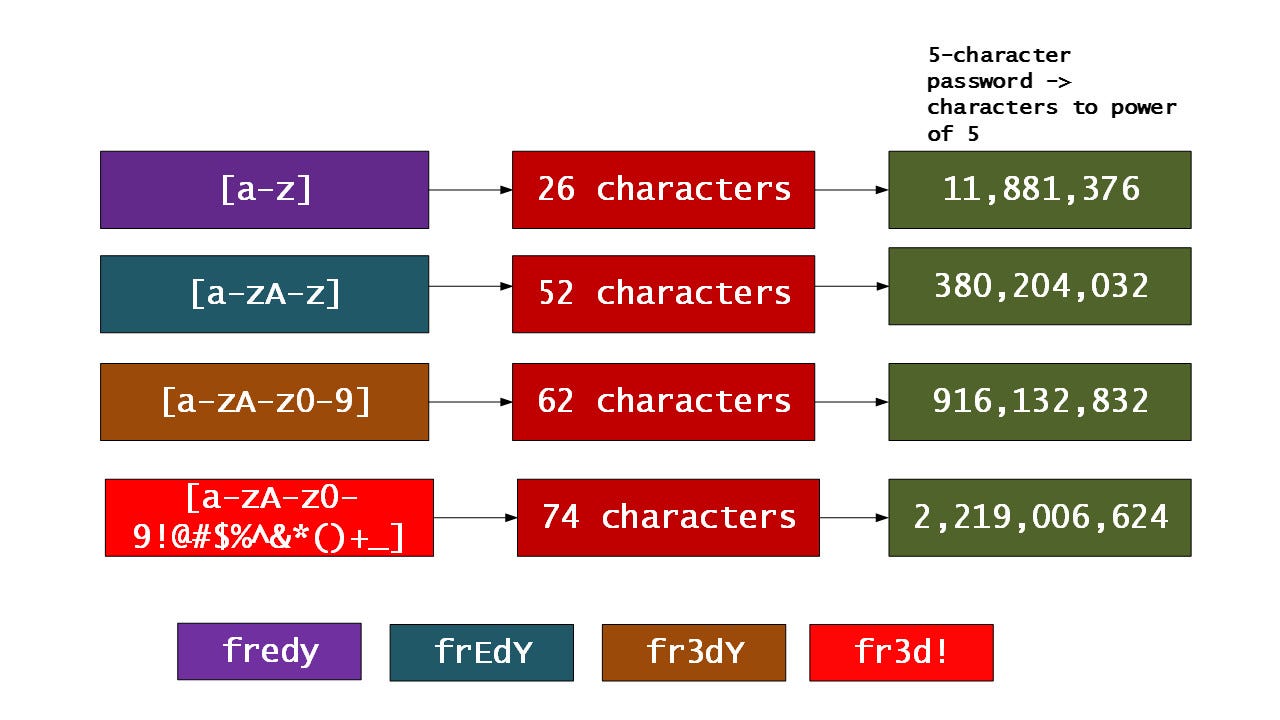 Например, если у нас есть строчные буквы [az], у нас есть 26 символов, и мы добавляем заглавные буквы [AZ], мы получаем 52 символа. Если у нас в пароле будет 5 символов, количество комбинаций паролей будет: