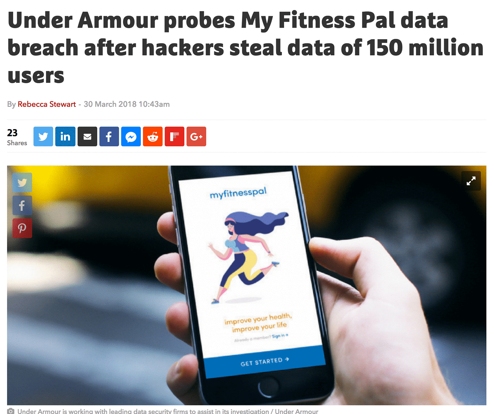 Недавнее нарушение данных 150 миллионов пользователей для приложения MyFittness создало заголовки на первой странице. Но когда мы смотрим на это, представленные данные не так уж плохи, как выглядят. В случае взлома данных только связанные с ними адреса электронной почты, имена пользователей и пароли и другие важные данные, такие как номера кредитных карт и дата рождения, были сегментированы от данных имени пользователя. Ответственная компания - Under Armour - даже сообщила в течение одной неделис момента открытия (что значительно улучшилось в таких компаниях, как Equifax, которая отчиталась много месяцев, или Uber, которая заняла больше года).