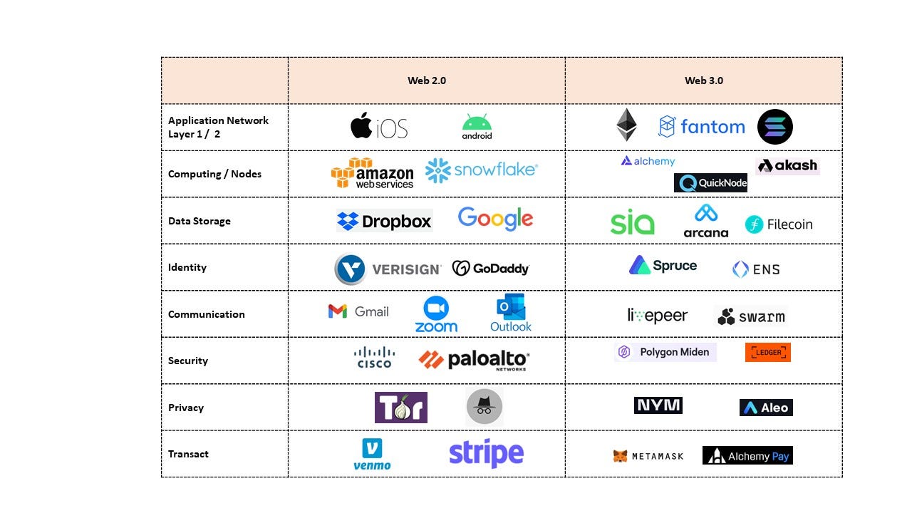 Чтобы упростить сравнение, ниже приведены некоторые примеры поставщиков инфраструктуры по нескольким направлениям в мире Web 2.0 и Web 3.0