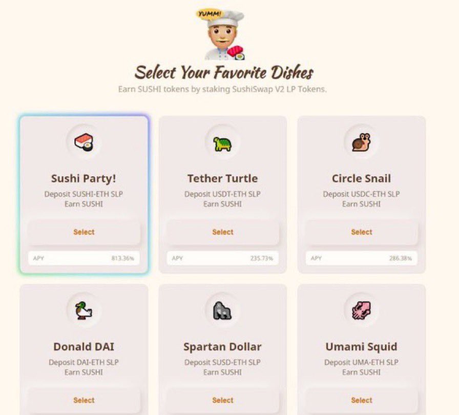 Sushi были уникальными. Это был форк смарт-контрактов Uniswap с дополнительным токеном управления, предоставляемым поставщикам ликвидности.