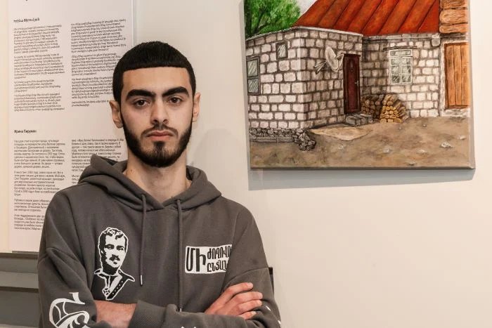 Стоит молодой человек со строгим лицом и пронизывающим взглядом. На нем худи с изображением Гарегина Нжде и подписью «Одна нация, одна семья». Молодого человека зовут Арсен Геворкян, он художник из Арцаха. Изображения на своей одежде Арсен нарисовал сам. Его работа - единственная картина среди фотографий. Молодой человек не имел возможности увидеть свой дом в последний раз, поскольку служил в армии и был переведен из постов прямиком в Степанакерт. Так Арсен рассказал свою историю через воспроизведение образа родного дома на холсте.