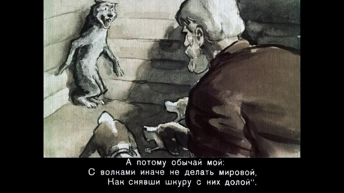 "Ты сер, а я, приятель, сед, И волчью вашу я давно натуру знаю; А потому обычай мой: С волками иначе не делать мировой, Как снявши шкуру с них долой ..."
