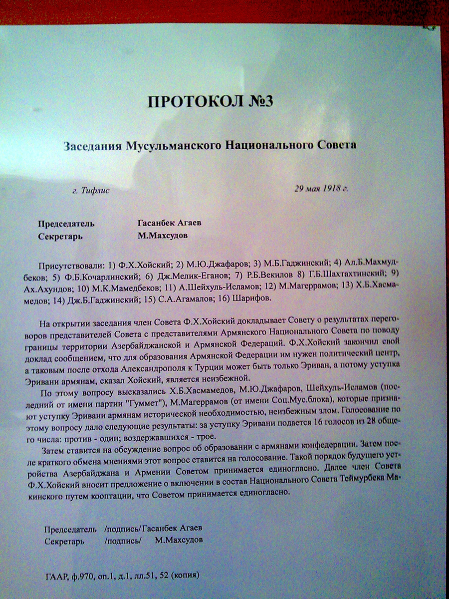 Молодая республика под давлением Запада была вынуждена уступить Эриванский уезд для создания армянского государства на территории исконных азербайджанских земель. Соответствующее решение было принято 29 мая 1918 года Азербайджанским Национальным Советом.