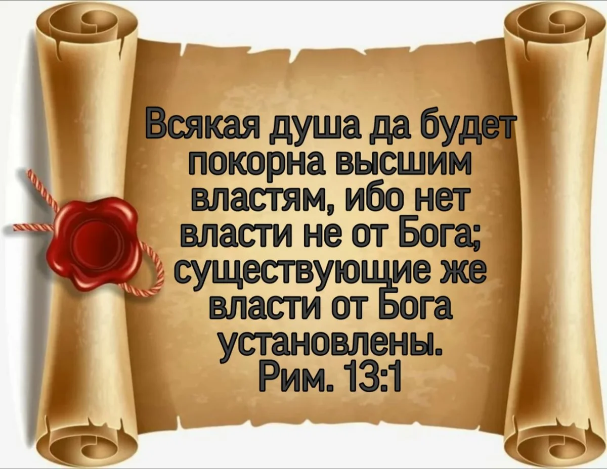 1. Всякая душа да будет покорна высшим властям, ибо нет власти не от Бога; существующие же власти от Бога установлены.
