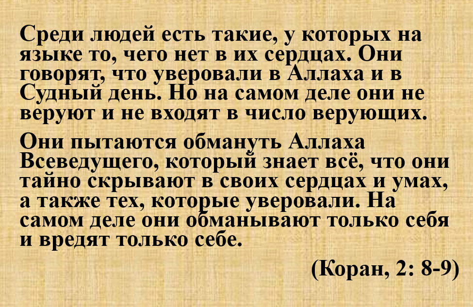 «Всем лицемерам и неверным уготован адский огонь, где они будут вечно пребывать. На них направлен гнев Аллаха, и будет им наказание в Судный день!».(сура 9 аят 68)