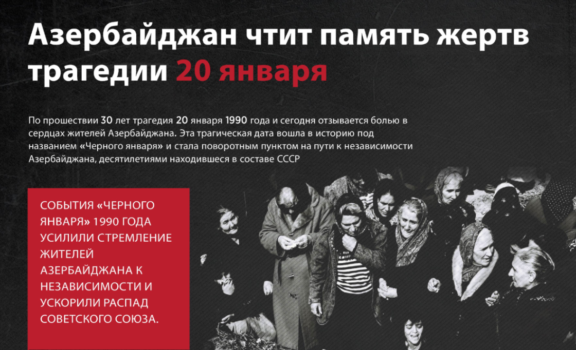 "20 января 1990 года - самый трагический день в истории Азербайджана. Но вместе с тем в ту ночь, в тот день азербайджанский народ продемонстрировал всему миру свой героизм, отвагу и самоотверженность. Поэтому в этот день мы всегда скорбим. Но в то же время мы испытываем чувство огромной гордости за то, что наш народ - героический народ, несгибаемый народ, непоколебимый народ.