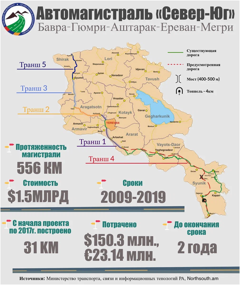 Напомним, что старт строительства автодороги "Север–Юг" в Армении был дан в 2009 году, когда было подписано первое кредитное соглашение с Азиатским банком развития. Спустя 13 лет, 1 июня 2022 года, министр территориального управления и инфраструктур Армении Гнел Саносян заявил, что к этому времени построено всего 5-6% дороги "Север-Юг".