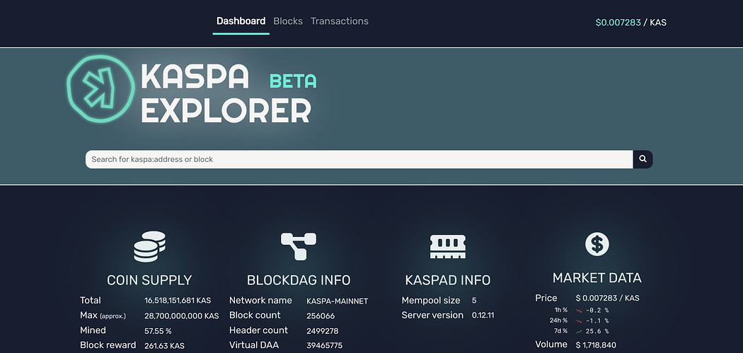 Kaspa Explorer is a utility for network metrics on the Kaspa network. It is designed to provide users with accurate network metrics such as supply data, mining information, market data, and a live feed of blocks and transactions. In addition, this tool is intended to give users a detailed overview of the Kaspa network and its activity, allowing them to keep track of its status and performance.