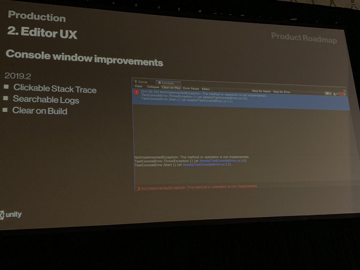В середине 2019 чуточку (совсем чуточку) улучшат окно консоли. Дадут возможность кликать на стек-трейс, искать в логах и чистить окно во время билда (странно, что до этого такой возможности не было).