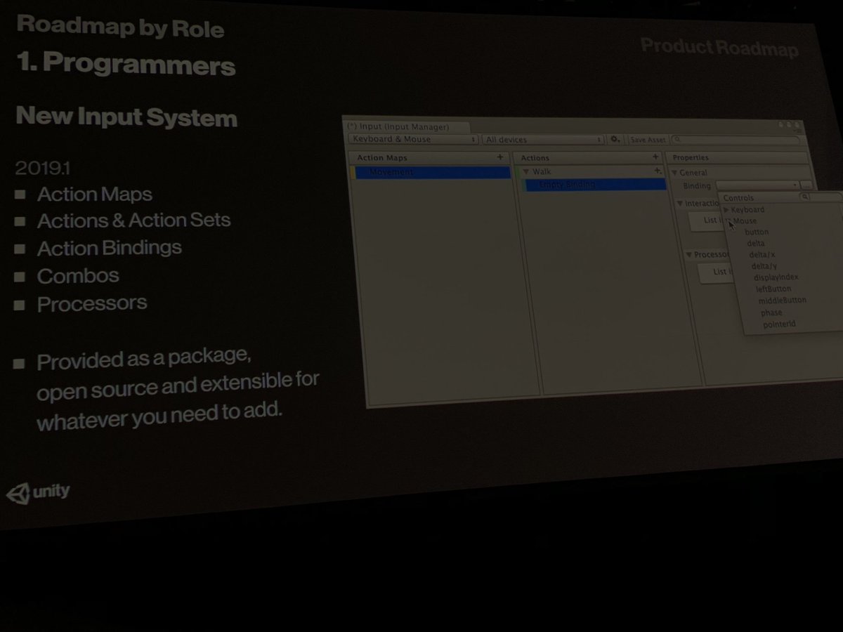 Человеческая система ввода придет в 2019.1. Нативная поддержка action map, action sets, bindings, combos (да, из коробки можно прописывать цепочки действий через WYSIWYG-редактор). Будет идти в качестве пакета и в опен-сорс. Если что, можно будет расширять своими силами.
