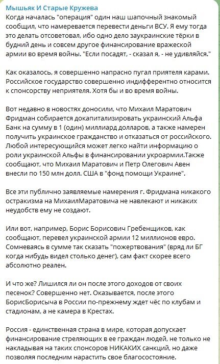 И таких подвигов на счету Михаила Маратовича не счесть. Так как - вам тоже кажется, что ничего необычного в возращении Фридмана в Россию нет? Кстати ходят упорные слухи о том, что вслед за беглым олигархом ожидается приезд второго "израильтянина" - Анатолия Чубайса. Как утверждают инсайдеры, экс-глава Роснано уже решил вопрос своей неприкосновенности, и буквально на днях почтит своим присутствием Москву. Ну и в заключении пост опубликованный в одном из Telegram-каналов, который наглядно дает понять, в чьем приезде наша власть не видит ничего необычного: