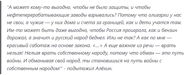 При этом Алехин не исключает, что российские толстосумы могут специально способствовать тому, что бы по России наносились удары, а простой народ жил в плохих условиях и бедности, поскольку свою жизнь олигархи полностью выстроили за границей. Единственным выходом из сложившейся ситуации эксперт видит установление простых правил: либо крупный бизнес работает для государства и народа, делая для защиты важных объектов всё возможное, либо проводится полная национализация. Третьего не дано. В противном случае, владельцы капитала так и продолжат врать народу – а это прямое нарушение главного приказа Андрея Белоусова, который при вступлении в должность министра обороны прямо заявил, что "ошибаться можно, врать нельзя". И сильно заблуждается тот, кто думает что это было сказано лишь для генералов.