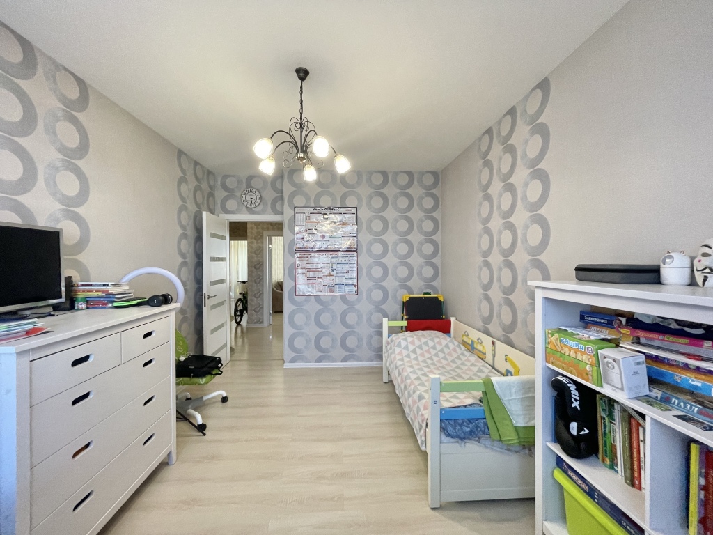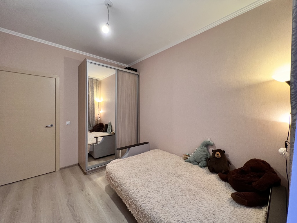 Двустороннее расположение — окна на восток и юг. Качественный ремонт от застройщика. Входит в семейную секцию — всего 4 квартиры на этаже. Есть общая кладовая с соседями.