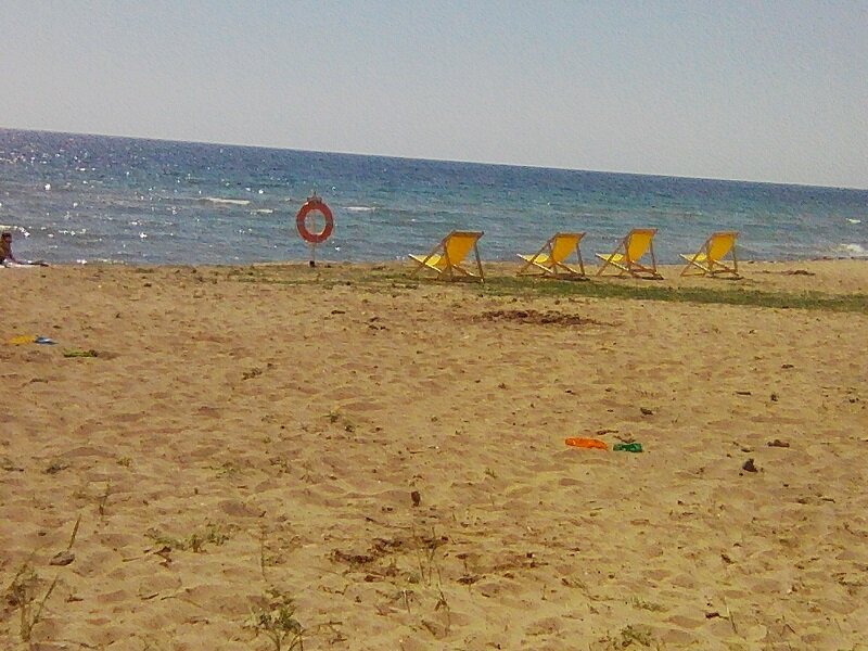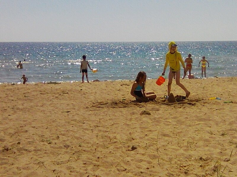 После вздохнув спокойно и свободно мы поехали в ближайший к Евпатории поселок, который называется Заозёрное. Пара километров от города. Он славится своим спокойствием и мелким морем, детям там рай. Вода там теплее конечно, чем в других местах. Пляж песок, гальки немного. Небольшие камни вдоль берега.