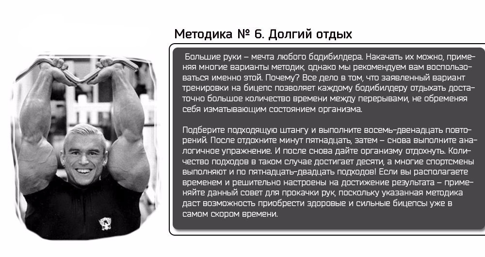 Данные методики посвящены описанию семи уникальных методик, позволяющих эффективно «накачать» свои руки до идеального состояния, а также, что называется, «пробудить» их для новых достижений. Данные упражнения целесообразно выполнять по той причине, что любая последующая тренировка, включающая заявленные методики, обогатится новейшими приемами и способами достижения сильных и красивых рук.
