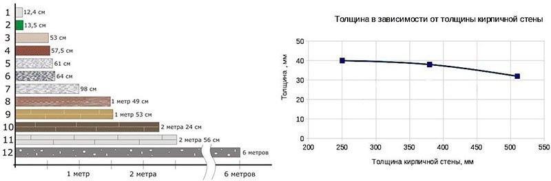 Производство пеноплекса для утепления стен включает в себя следующие технологические операции:Гранулы материала загружают в экструдер, где они нагреваются до в 130-140°С;В порцию добавляются вспениватели – порофоры;Загустевшая масса выдавливается из экструдера на транспортерную ленту, после чего режется на размерные плиты;Смесь полуфабриката пеноплекса для утепления стен снаружи состоит не только из пенополистирола и порофоров – в нее добавляют антиоксиданты, предназначенные для предотвращения термического окисления при переработке и нарушения целостности утеплителя при эксплуатации, антипиреновые вещества для повышения огнестойкости, а также антистатические, светостабилизирующие и модифицирующие добавки, защищающие теплоизоляционный материал от воздействия внешних факторов.Основные положительные параметры материала:Низкое поглощение влаги у пенополистирола — главное преимущество;Минимальный коэффициент теплопроводности, что позволяет, проводя расчет толщины, выбирать тонкие плиты;Высокая паронепроницаемость пеноплекса: плита толщиной 20 мм заменяет один слой рубероида, но при этом еще и утепляет рабочую поверхность;Высокая прочность на сжатие и другие механические нагрузки. Метод экструзии в производстве теплоизоляции позволяет равномерно распределять ячейки материала, улучшая качества плотности и прочности;Легкий и быстрый монтаж утеплителя за счет небольшого веса и хорошей плотности;Длительный срок эксплуатации экструдированного пенопласта – до 50 лет;Отличная шумоизоляция и минимальная химическая активность.Диапазон размеров пеноплекса:Длина плиты – от 120 до 240 см;Ширина плиты – 60 см;Толщина – от 2,0 до 12,0 см.Недостатки экструдированного пенопласта:Горючесть групп Г3-Г4, образование токсичного дыма при возгорании;Полимерные добавки в составе материала при солнечном облучении могут испарять токсичные вещества. Поэтому оптимальное применение пеноплекса – наружное, например, утепление кирпичной кладки;Продукты нефтепереработки и некоторые органические вещества могут деформировать пеноплекс толщина которого может быть любой. Это такие вещества, как: формальдегид и формалин, ацетон и метилэтилкетон; жидкости с этилом в составе, бензольные компоненты, полиэфирные смолы, синтетические краски и ГСМ.Свойства теплопроводности определяют качество утепления пеноплэксом. Чем больше коэффициент теплопроводности, тем меньше сантиметров будет слой утепляющего материала. Укладывать изолятор изнутри или снаружи – зависит от характеристик паропроницаемости и прочности (плотности). Сравнить параметры популярных материалов для утепления пола и других поверхностей можно, изучив данные в таблице:Из таблицы понятно, что пенопластовая теплоизоляция имеет среднее значение теплопроводности, которое немного меньше, чем у пенополиуретана, мастик и рулонных материалов. Но выбрать пеноплекс можно только за то, что слой такой жидкой изоляции не имеет стыков и швов, как у плитных утеплителей, сколько бы ни наносилось слоев на поверхность.Для точных расчётов применяют формулу Q = R х Y, где:Q отражает толщину стены в метрах;R – коэффициент сопротивления теплопередаче, который варьируется в зависимости от климатической зоны региона. Средняя величина — 2,1 кв. м•°С/Вт;Y – Значение теплопроводности материала, В