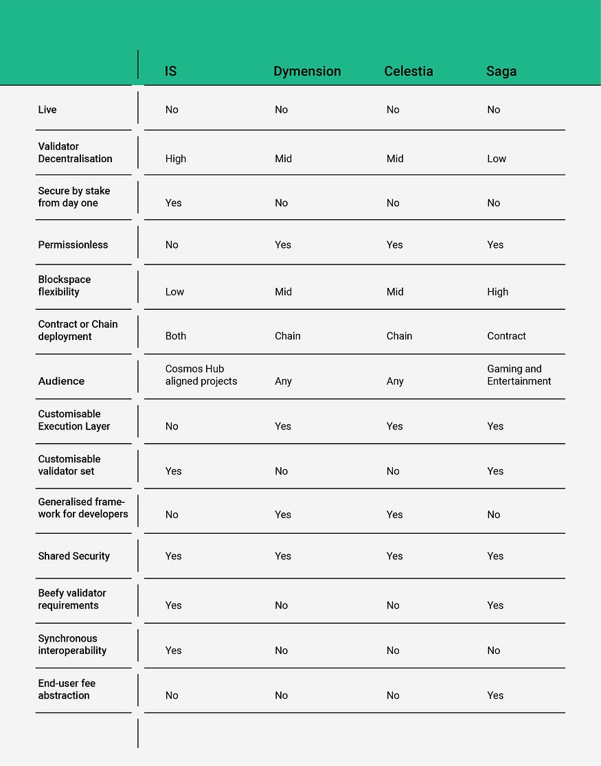 Обзор вариантов дизайна, сделанных Interchain Security, Dymension, Celestia и Saga.