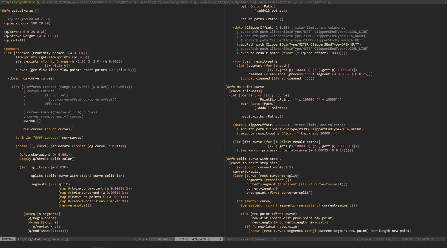 Вот так, спустя несколько сотен итераций, первоначальная маленькая программа обрастает кодом и выдает тот самый генеративный арт имени Тайлера Хоббса.