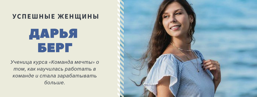 У Дарьи Берг бизнес рос стремительными темпами. Проблема была в другом — она боялась расширять команду и поэтому не могла увеличивать оборот и зарабатывать больше. Она рассказывает, как прошла курс «Команда мечты», научилась работать с людьми в команде и за полгода увеличила прибыль от 150 до 350 тысяч рублей в месяц.
