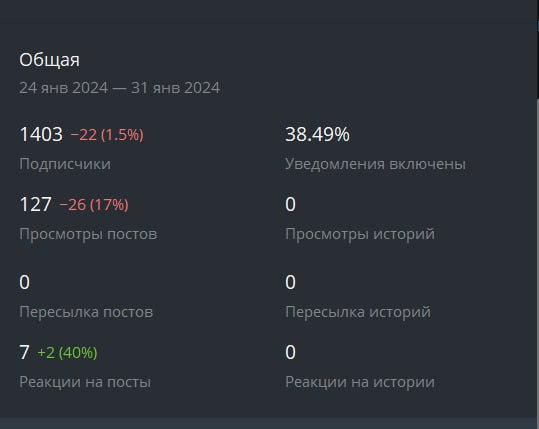 Комментарий: Охваты очень низкие по отношению к количеству подписчиков на канале. Большая часть вовлечения была потеряна из-за непривлекательного контента или на канале вовсе не было ранее живой аудитории.