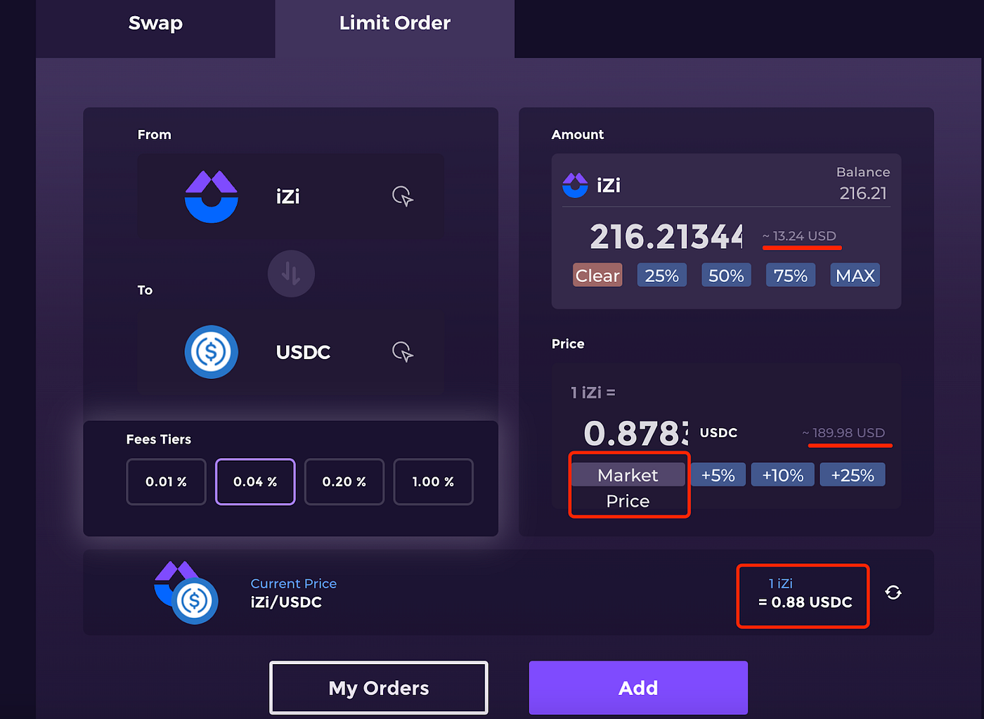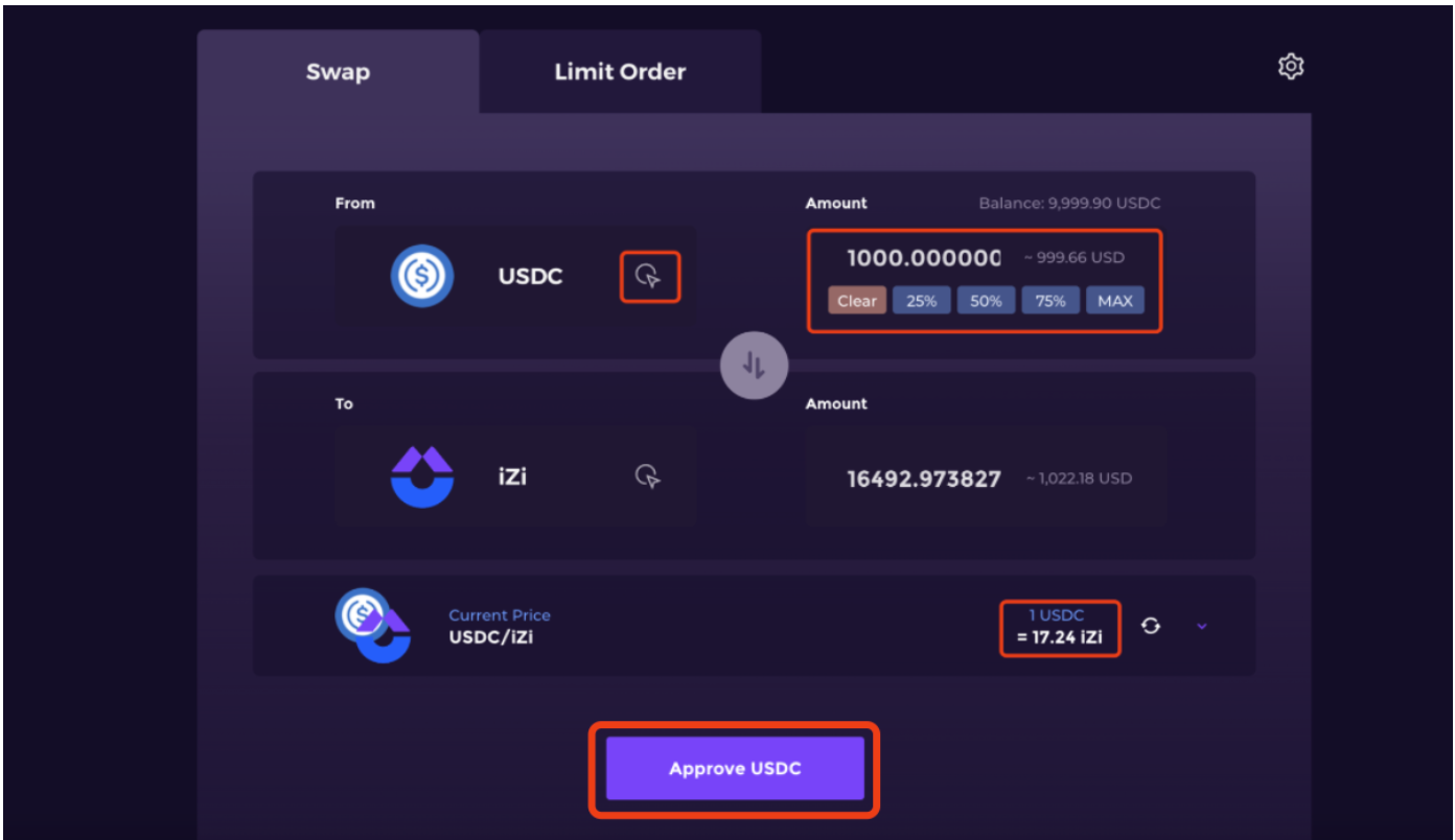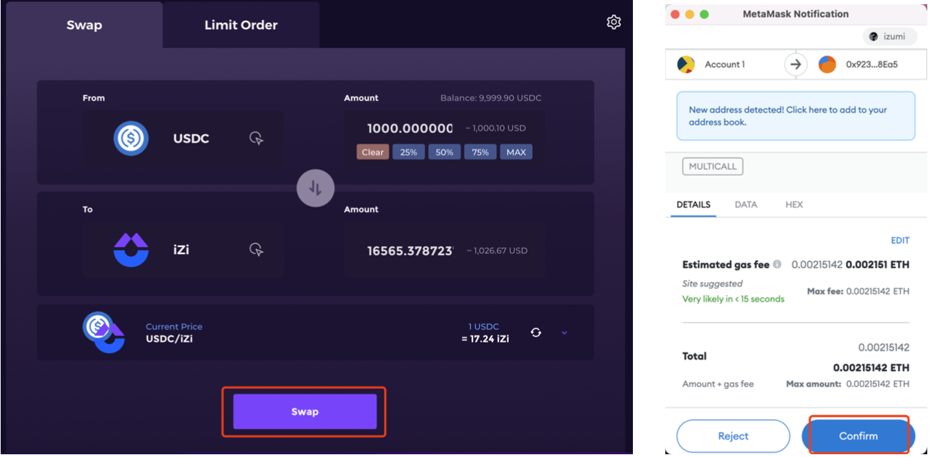 У правому нижньому куті спливаючого вікна ви можете побачити обмінний курс токена USDC/iZi.