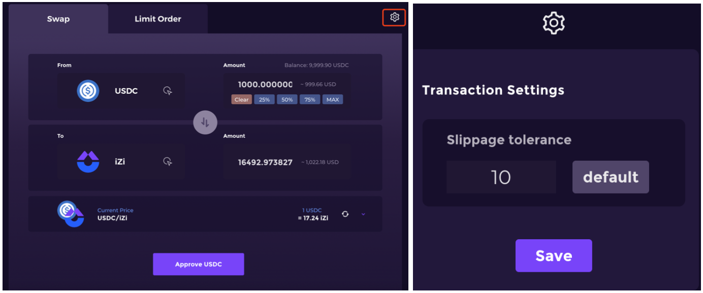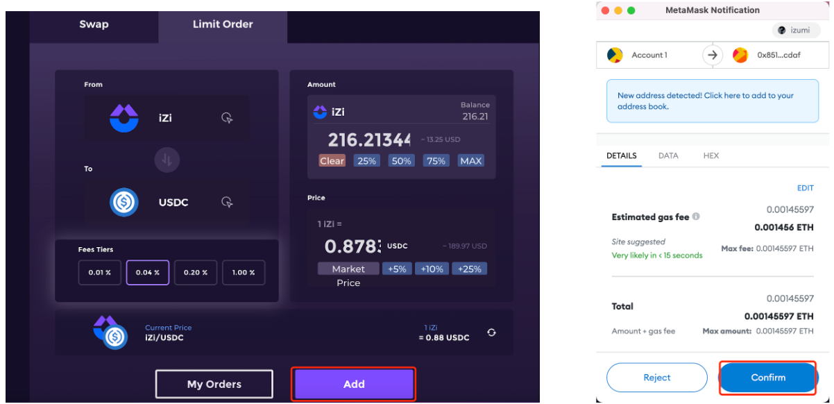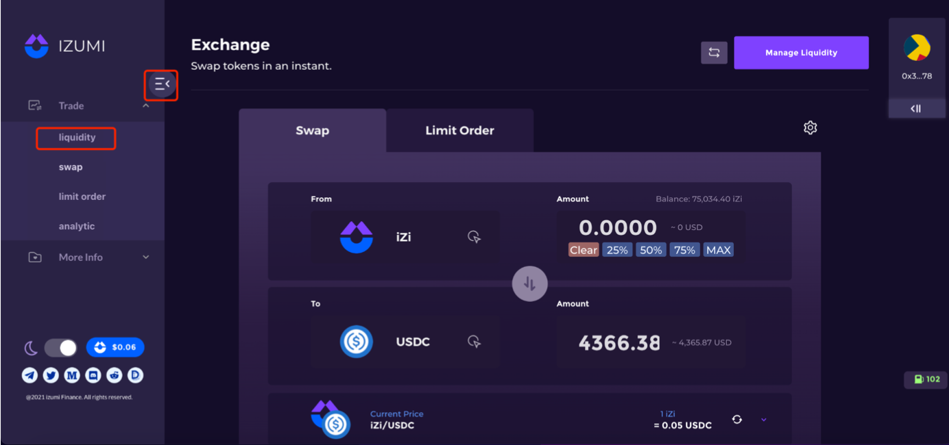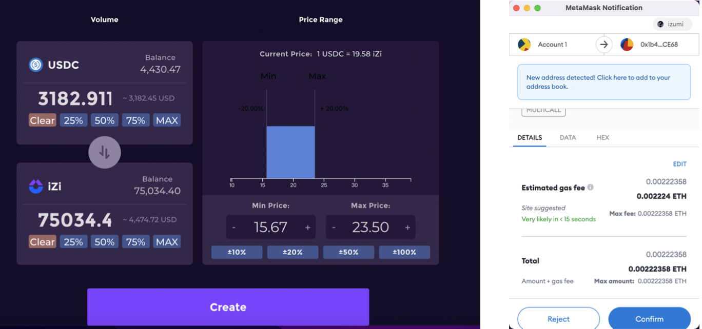 У правому нижньому куті спливаючого вікна ви можете побачити обмінний курс токена USDC/iZi.