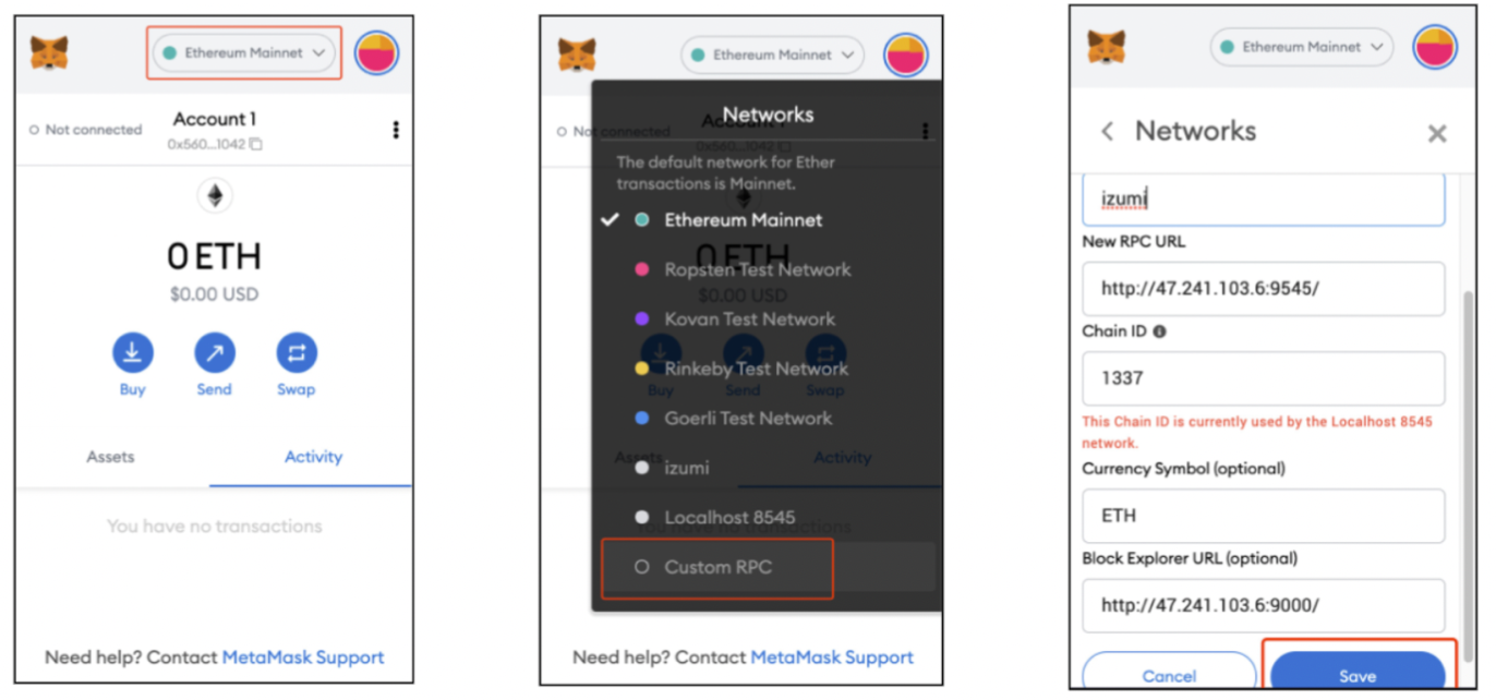 Натисніть кнопку «Під'єднати гаманець», щоб під'єднати MetaMask, і перейдіть на «izumi Network».