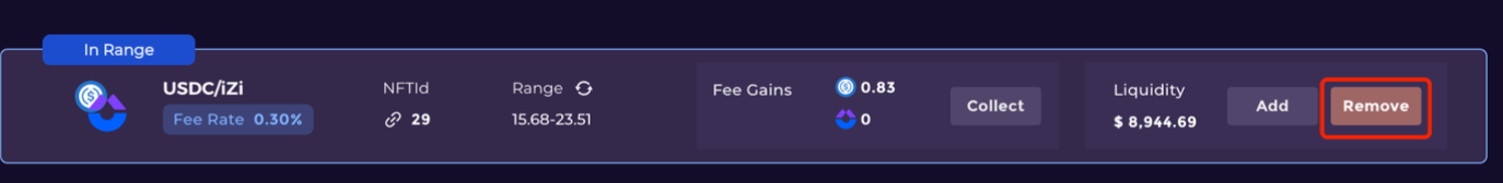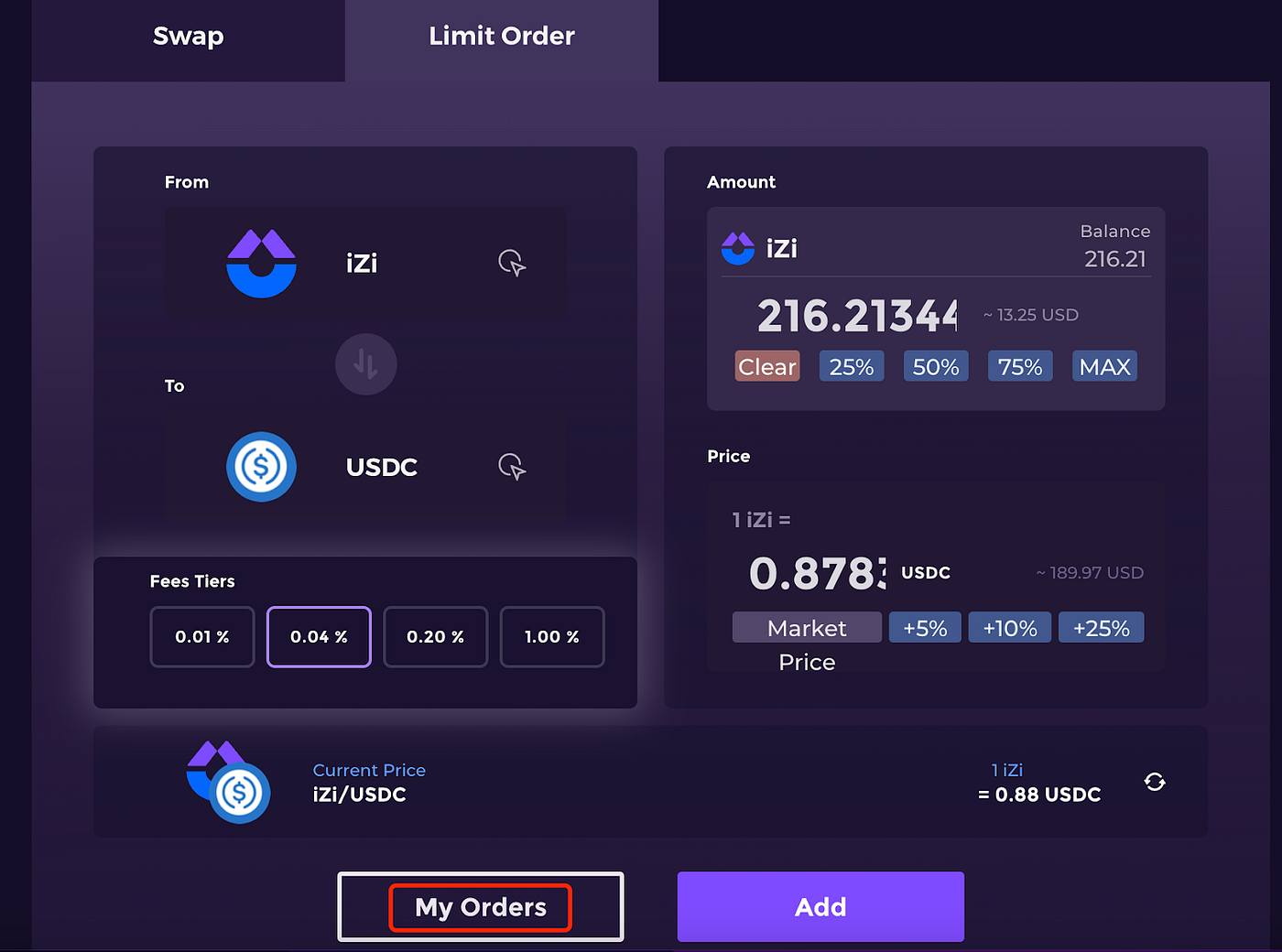 Виберіть ліквідність токена, яку хочете додати, наприклад, USDC та izi. Потім оберіть комісію за транзакцію, яку ви стягуватимете.