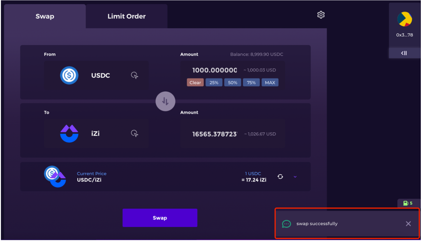 Ви отримаєте лише тестові токени ETH та iZi, ви можете обміняти iZi на USDC за допомогою функції Swap.