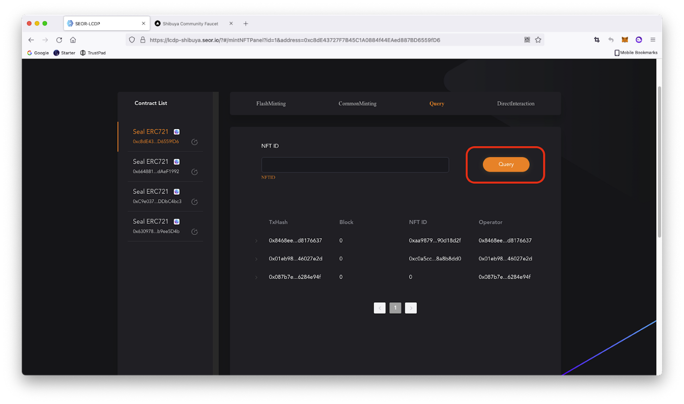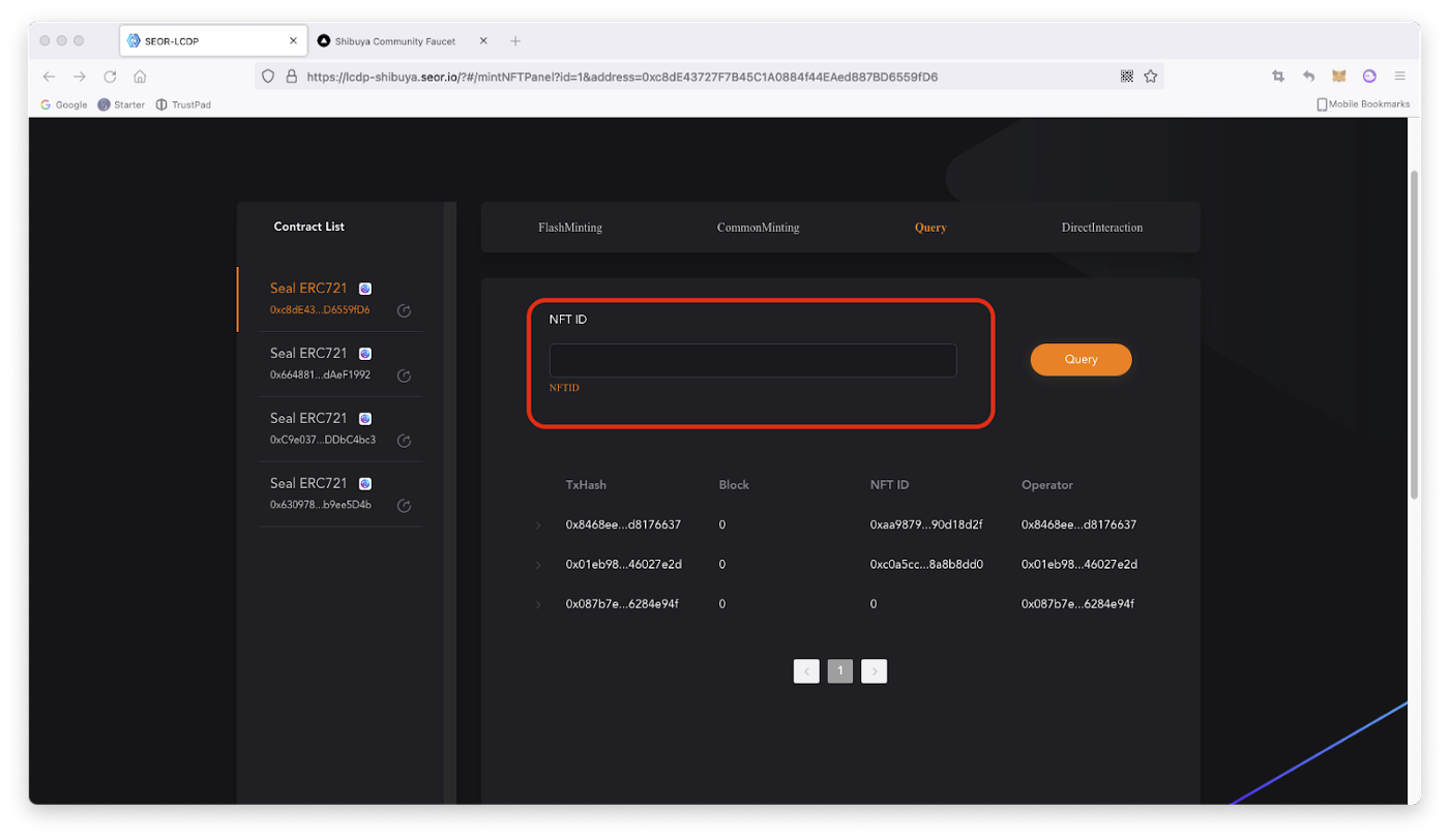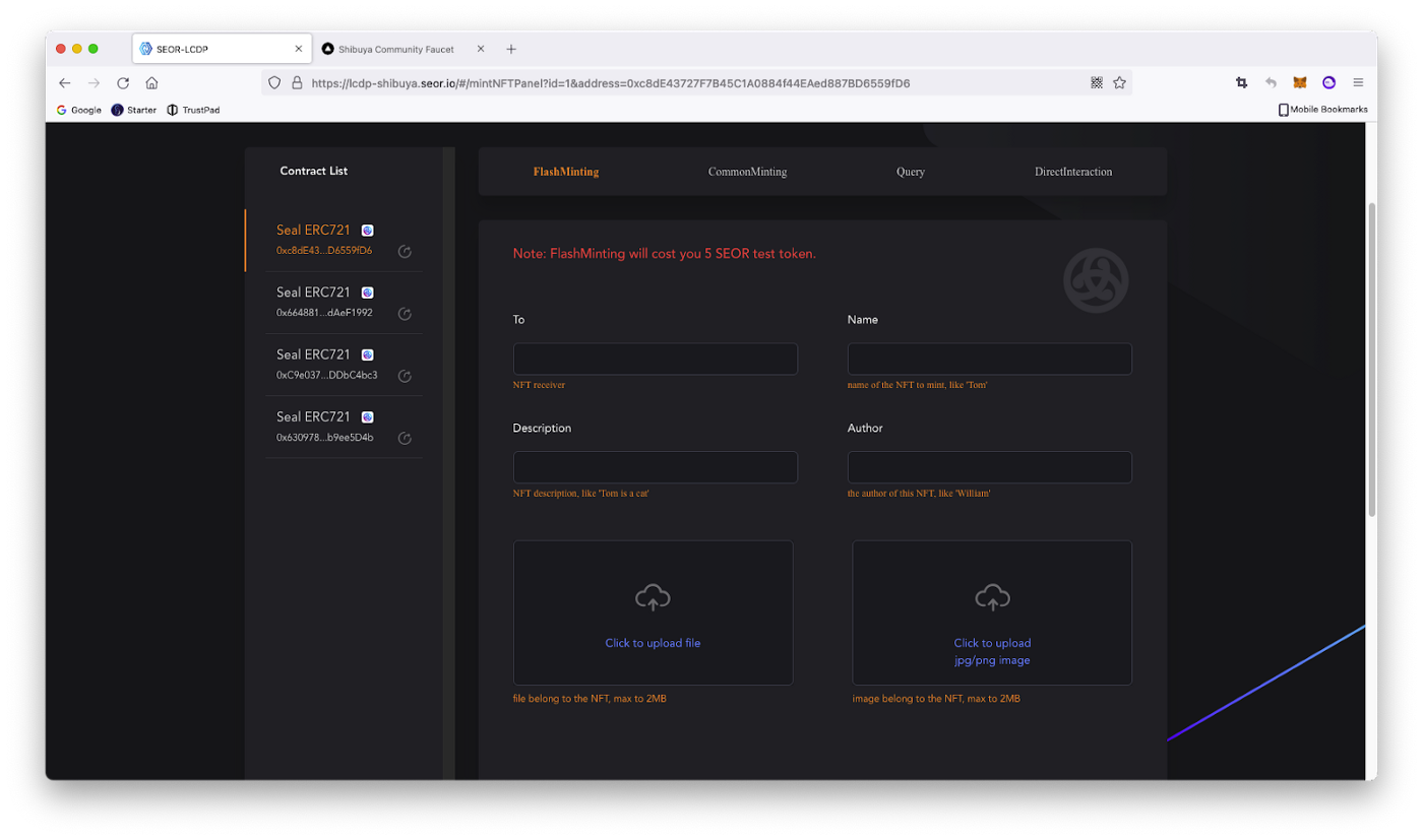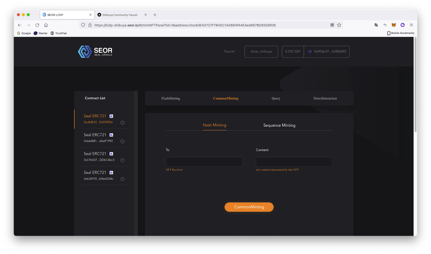 Панель управління контракту поділена на чотири частини: FlsashMinting , CommonMinting , Query , й DirectInteraction.