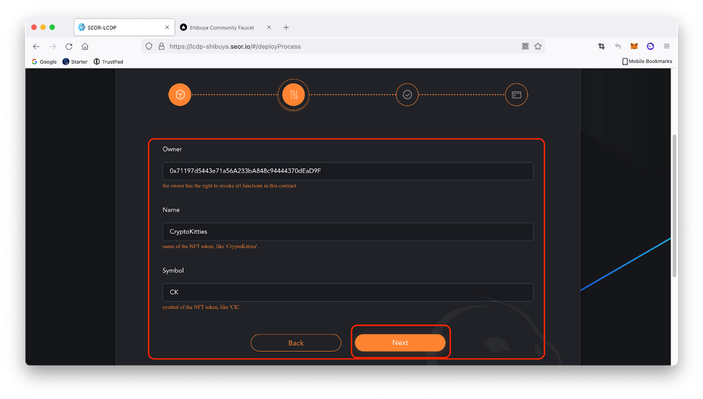 4. Другий крок — Заповнюємо поля «Owner» (власник контракту), «Name» (назва контракту) й «Symbol» (символ токену), для встановлення контракту. Натискаємо Next.