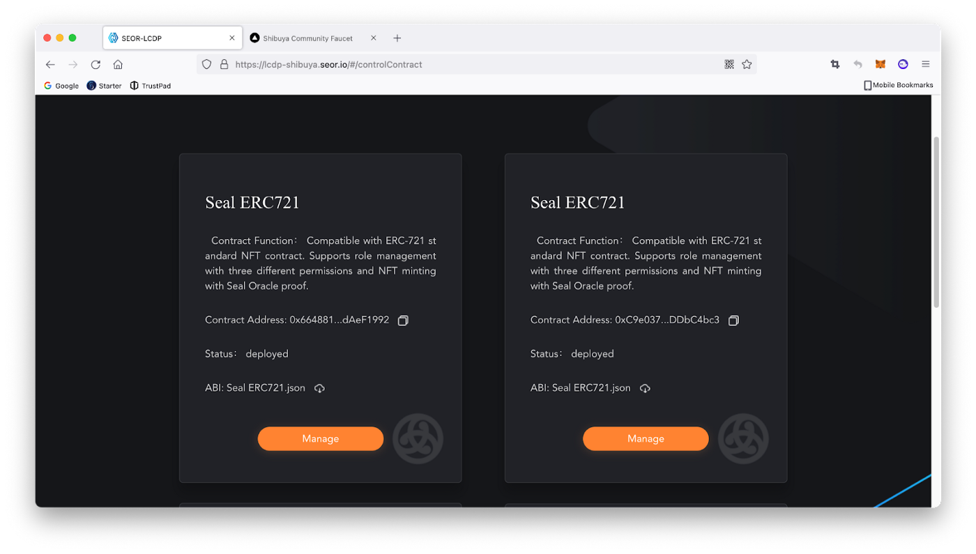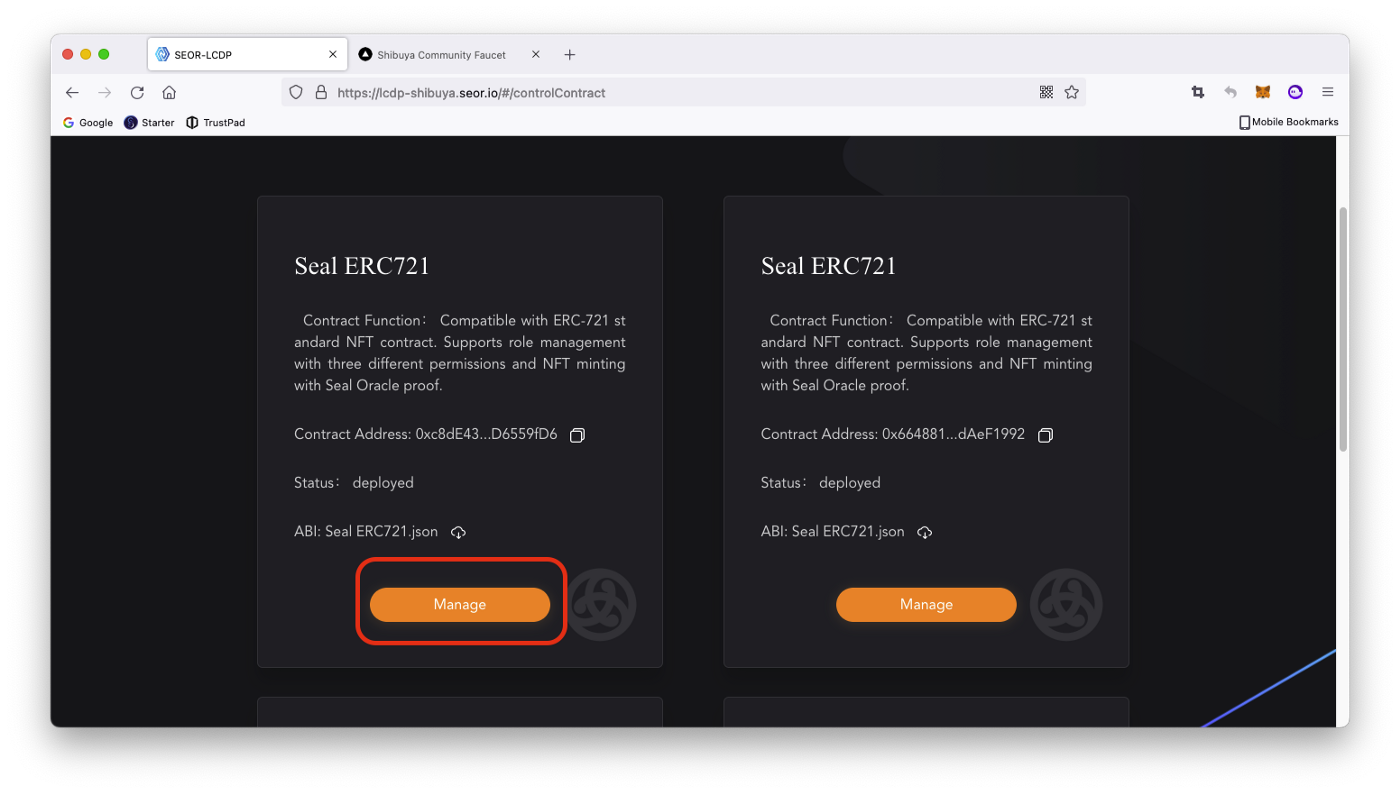 2. Знаходимо розгорнутий контракт Seal ERC721 й натискаємо «Manage».