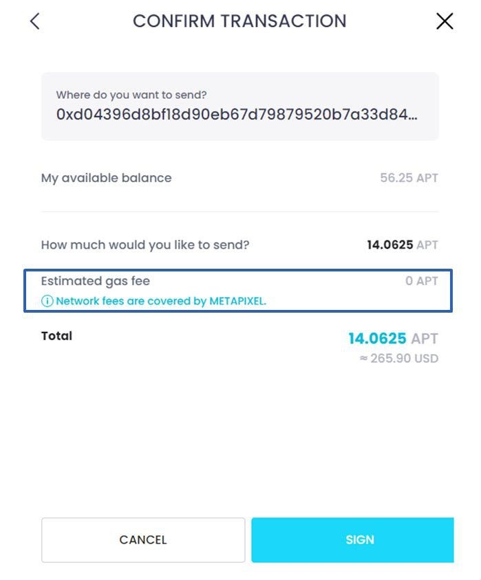 В случае с рис. 3 для CoinType установлено значение APT, а комиссия за платеж установлена на 0. Здесь APT можно отправить без получения платы за газ от пользователя. Платит комиссию METAPIXEL.