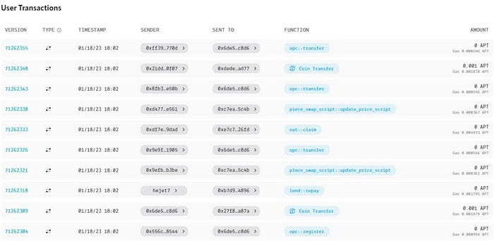 К счастью, плата за газ в Aptos очень дешевая. Ниже приведены записи о плате за газ, взятые в произвольное время в течение одного дня в Aptos Explorer. Они варьируются от 0,0067 до 0,08 долларов США за транзакцию, что очень мало по сравнению с Ethereum, если сравнивать только с ним. Однако, независимо от того, насколько это дешево, если не требуется абсолютно 0 газа, для пользователей все еще существует барьер, потому что они должны приобрести некоторое количество APT, чтобы использовать любую услугу.