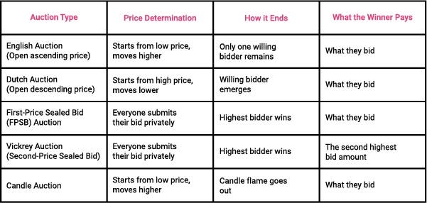 Существует множество различных форматов аукционов, которые можно использовать, мы рассмотрим несколько, но не все из них используются в аукционах на блокчейне. Поскольку некоторым из них потребуется больше информации и больше операций по настройке, они сделают затраты на развертывание смарт-контрактов более дорогими.